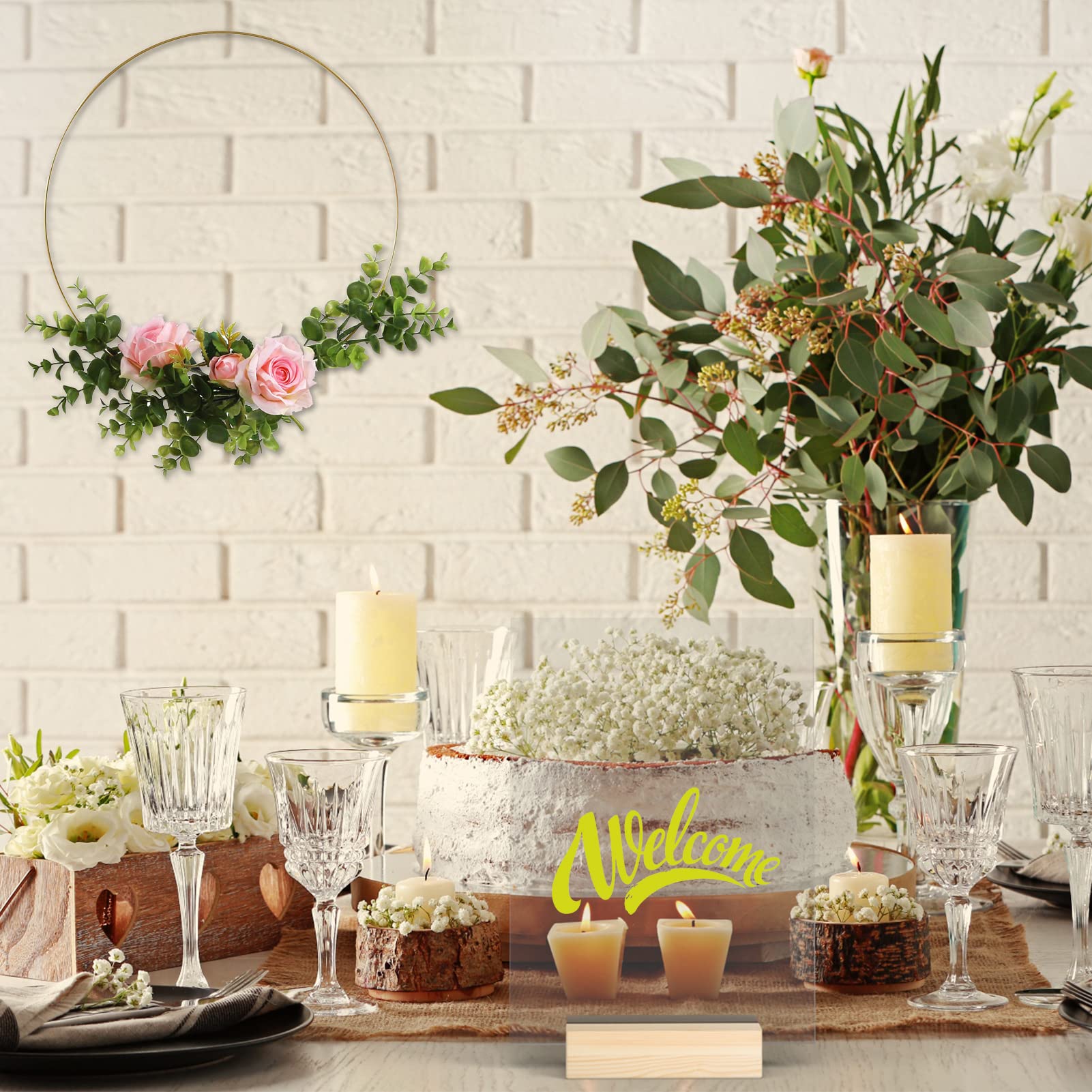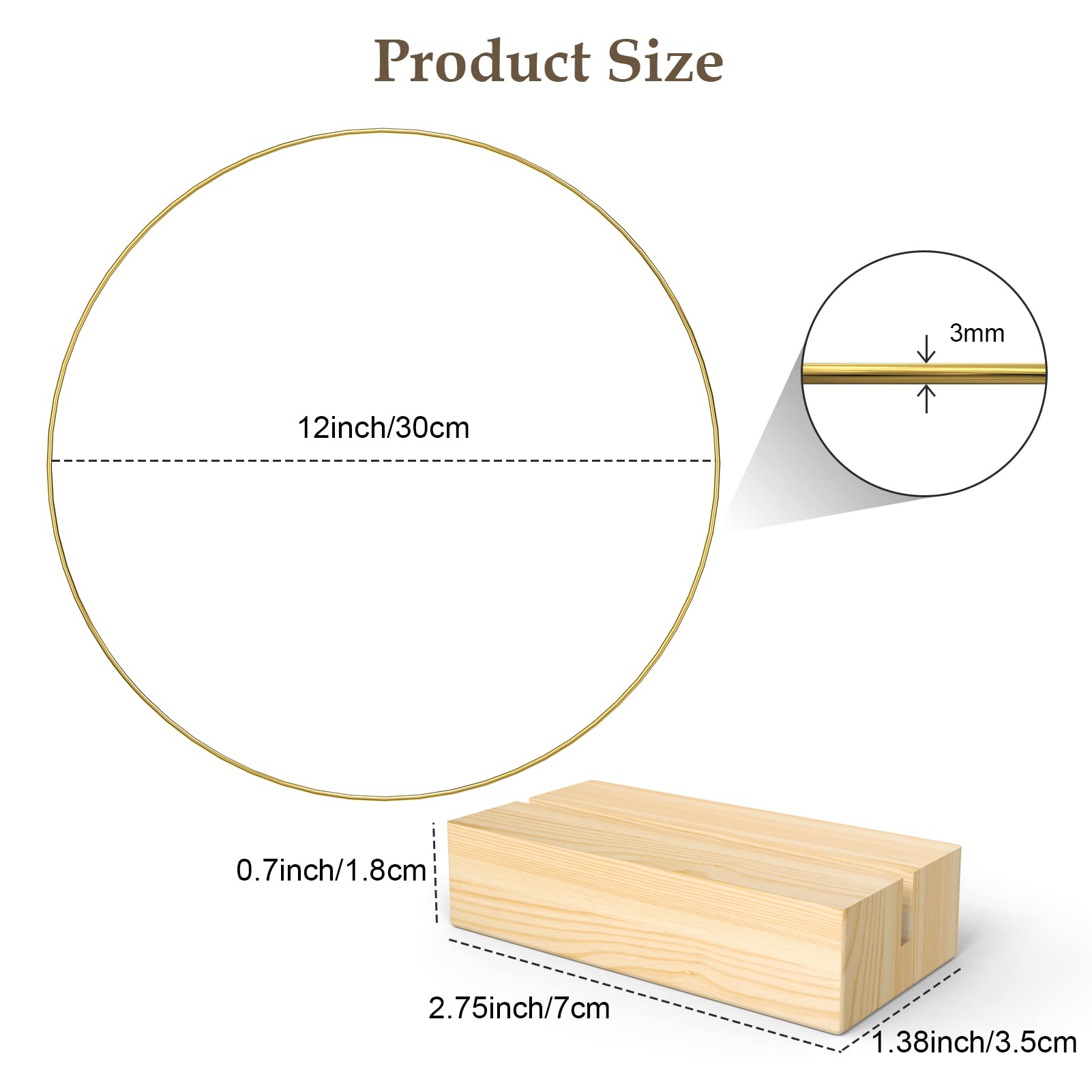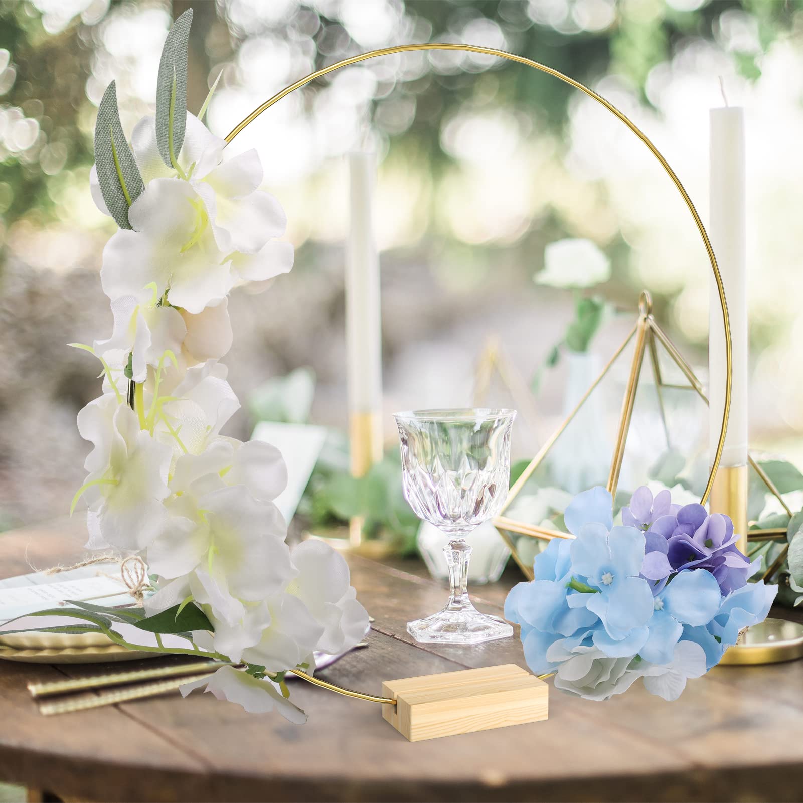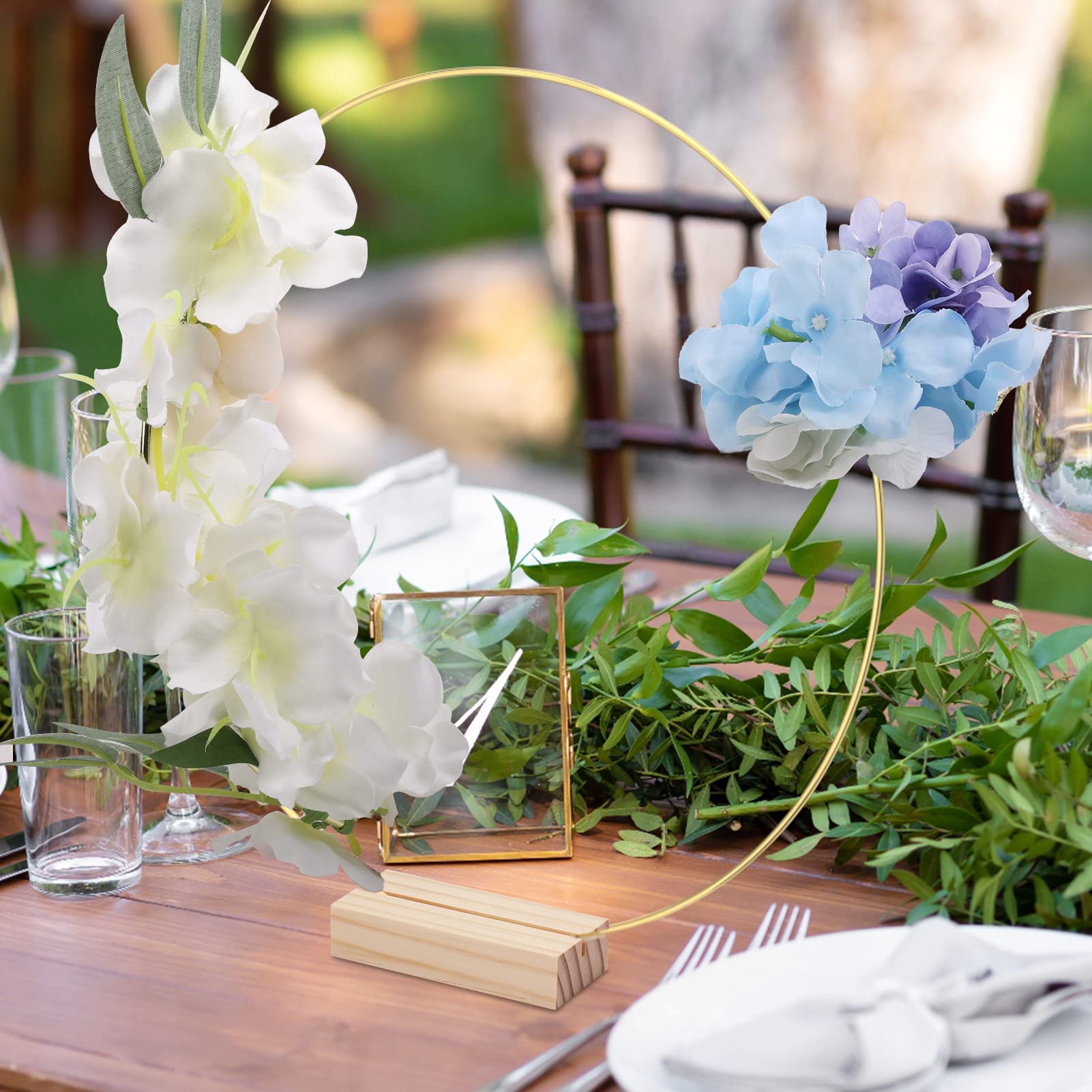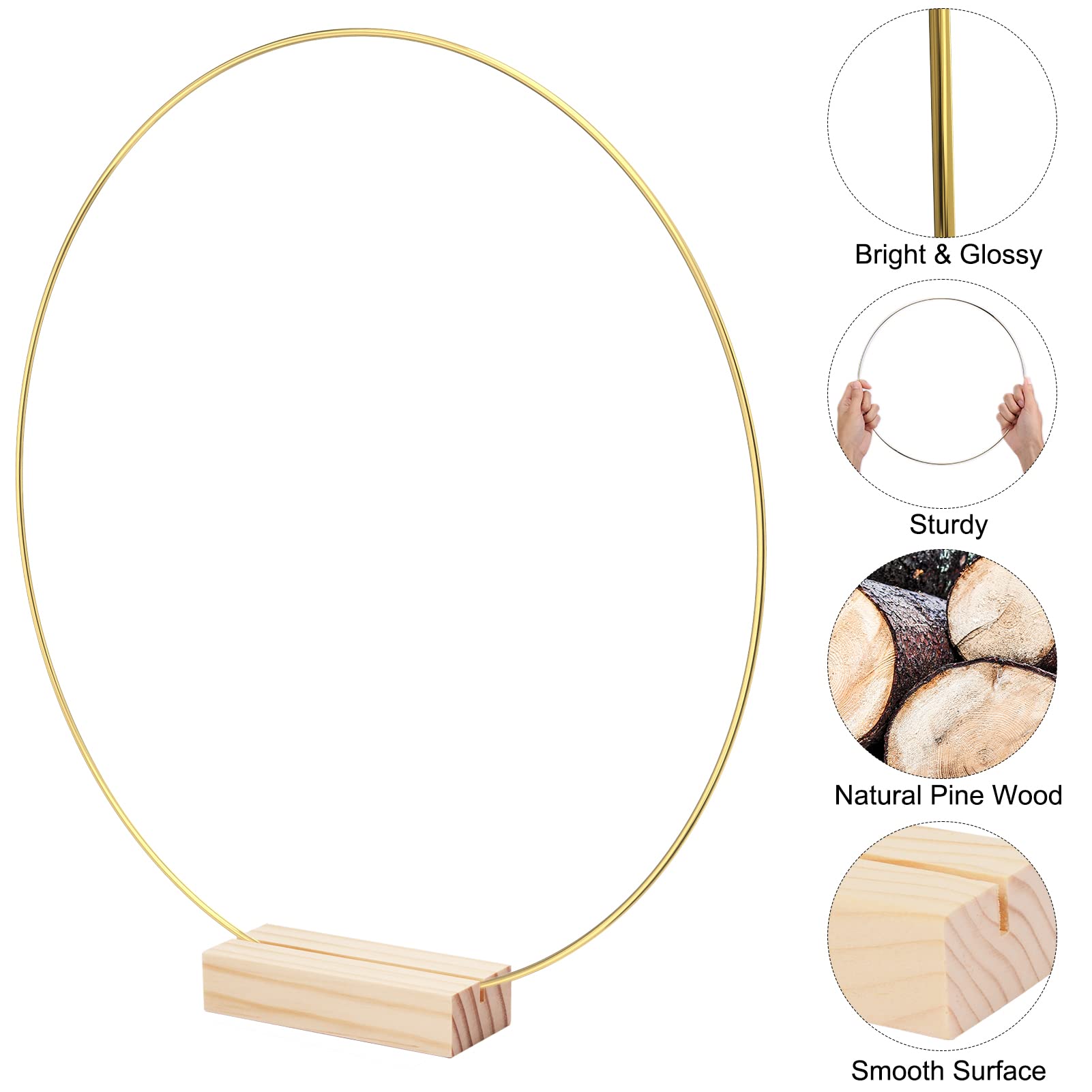 Package Includes: Coming with 6 pieces of 12 inches / 30 cm gold metal rings and 6 pieces of natural wooden card holders, suitable for DIY decoration of wedding tabletop@Premium Material: The gold floral hoops are made of sturdy metal, which is strong and not easy to break or deform. The surface is glazed to protect it from oxidation and rust. The wooden stands are made of natural pine wood with a smooth surface@Classic Color: The metal floral hoops are gold, simple and timeless, and the wooden stand has a natural wood grain on the surface, which is perfect for your wedding table decoration@DIY Craft Hoops: You can easily combine a metal ring with a wooden stand, and then you can wrap fabric, ribbon, plants, and other materials around the metal ring to make any amazing metal floral hoop centerpiece, these unique and eye-catching crafts can very decorate your wedding well@Wonderful Gift: The metal floral hoop centerpieces make a perfect luxury and practical gift for your loved ones and friends for weddings, anniversaries, birthdays, Valentine's Day and housewarmings